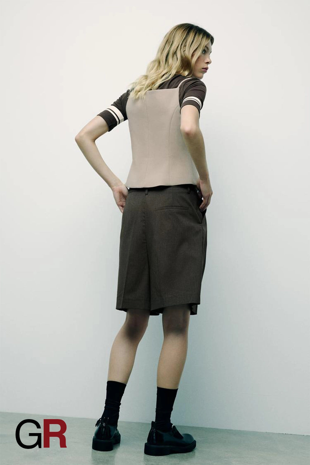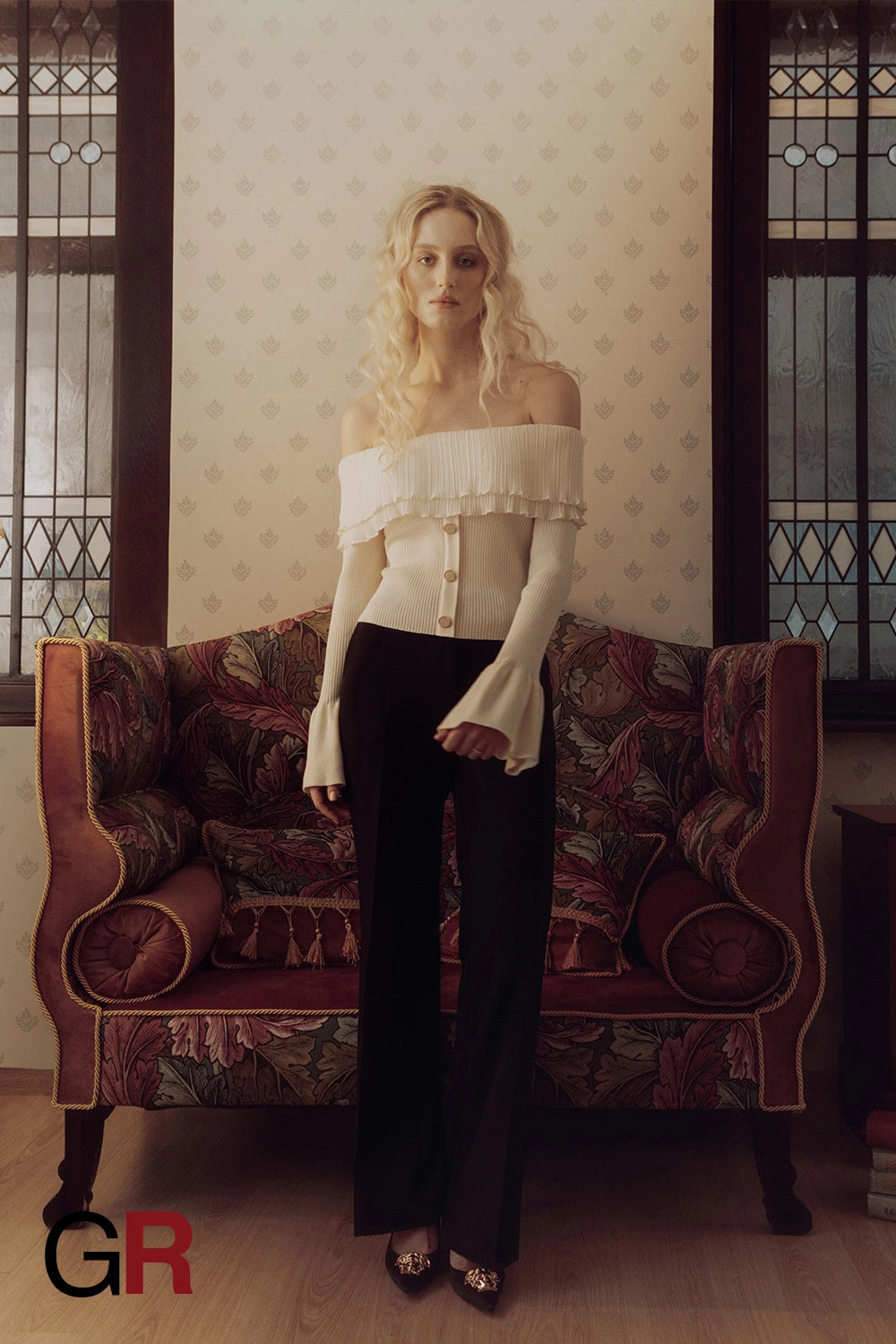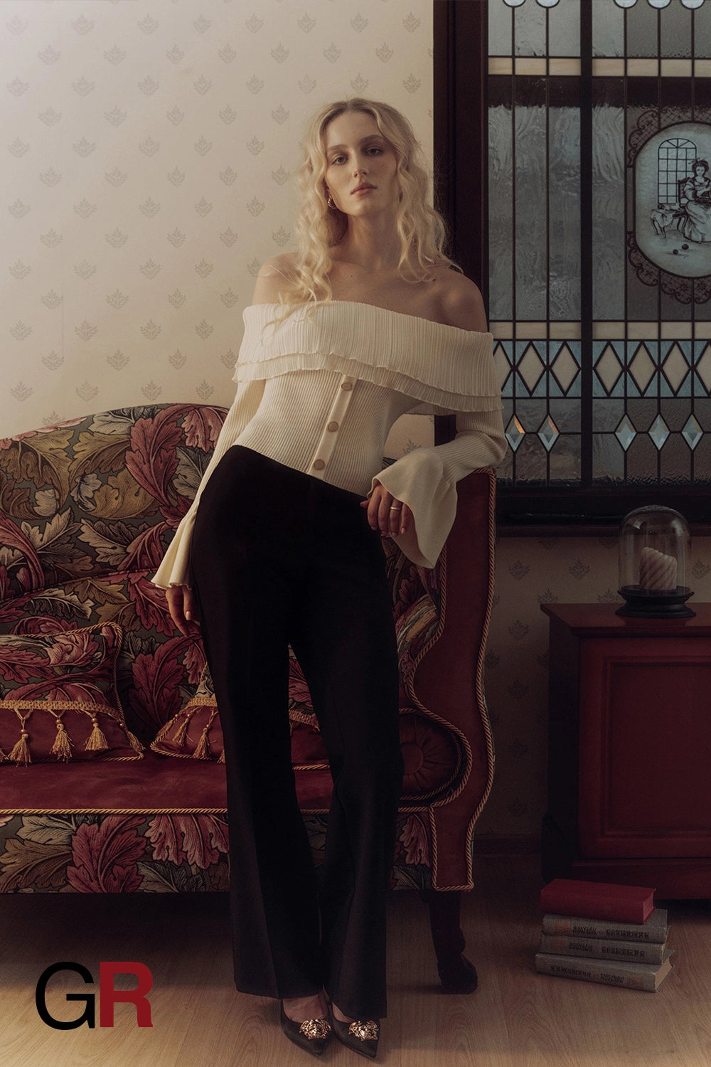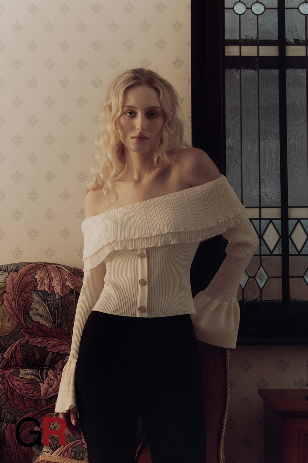Beiges Lounge-Top „Grace“ aus Velours mit schrägen Schultern -